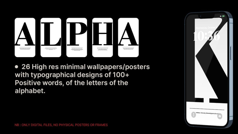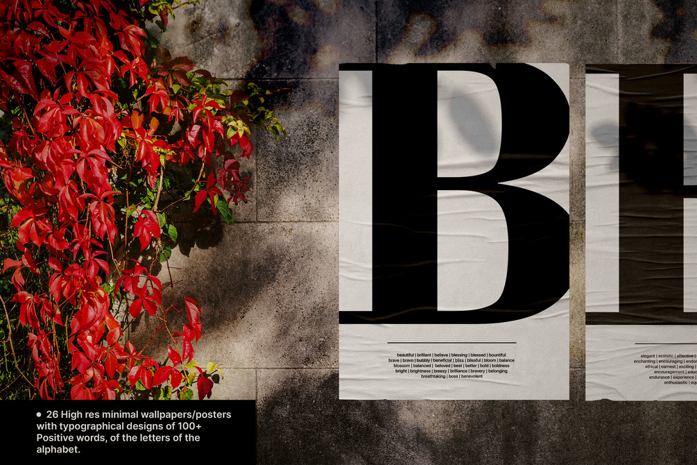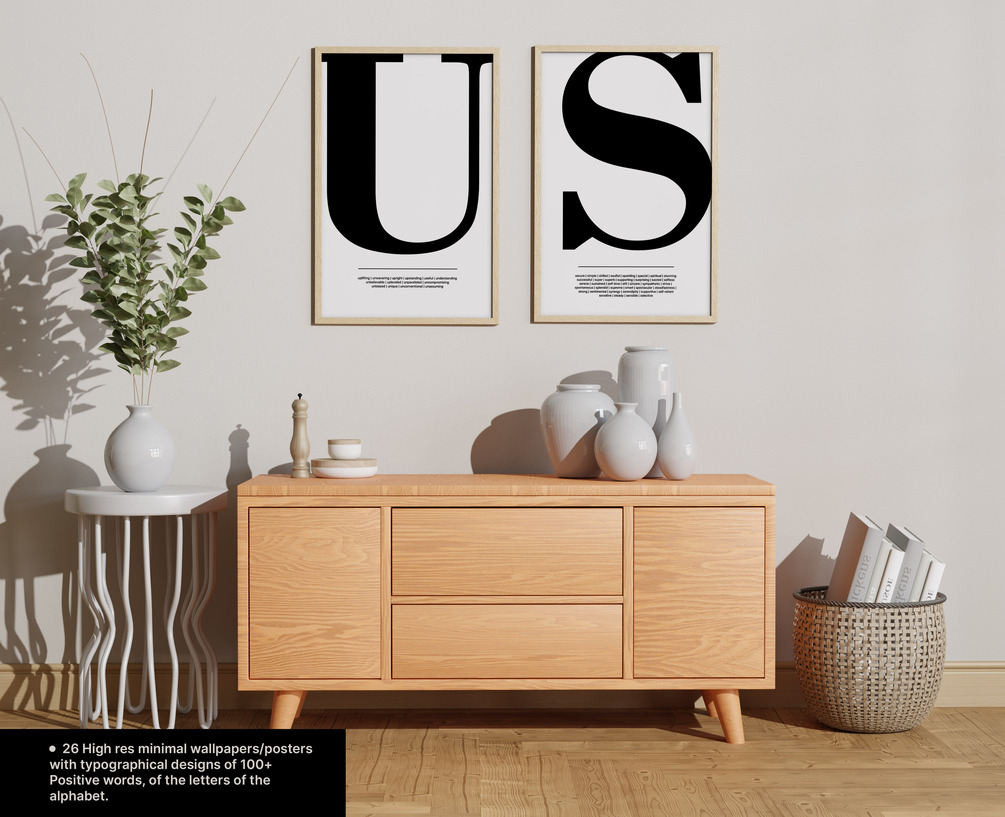 26 High res minimal wallpapers/posters with typographical designs of 100+ Positive words, of the letters of the alphabet